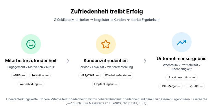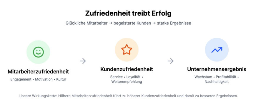 Klingt logisch und so einfach - und in der Praxis? Immer zufriedene Mitarbeiter? Wenig Fluktuation? Die passenden neuen Mitarbeiter/innen kommen von alleine? Der Kundenstamm wächst durch die positive Mund-zu-Mund-Propaganda? Die Kunden sind bereit auch ein wenig mehr zu bezahlen für das mehr an Betreuung, Kundenservice und passenden Produkten? Preisverhandlungen sind leichter weil es kaum vergleichbare Marktbegleiter mit ähnlich gutem Service gibt? Die höhere Marge gibt Spielraum für Weiterentwicklungen, Weiterbildungen und auch materielle und monetäre Anreize der Belegschaft bis hin zu flexiblen Arbeitszeit- und -raum-Modellen?